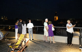 Das Tolle: Till Meßmer lädt die Gäste auf das Dach des Vereinte VR Bank Forums ein. Der Blick über das abendliche Speyer ist wunderschön.