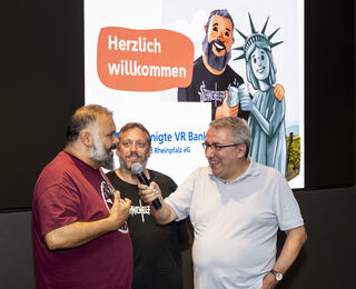 Der Schwetzinger Zeitungsverlag verantwortet seit diesem Jahr das Pfalzclub-Magazin. Sozusagen als "Einstand" gab es den von Chefredakteur Jürgen Gruler organisierten Pfalzclub-Abend exklusiv für Mitglieder mit Regisseur Benjamin Wagener und Darsteller Monji El Beji von "Hiwwe wie driwwe 2". Vereinte VR Bank-Vorstandssprecher Till Meßmer hat hierfür die Räumlichkeiten und Verköstigung im Vereinte VR Bank Forum in Speyer übernommen.