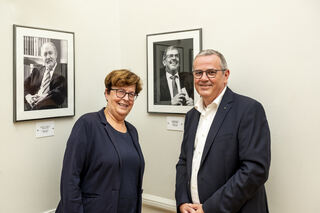 Hansjörg Eger und Bürgermeisterin Monika Kabs vor dem Porträt der letzten beiden OBs Werner Schineller und (rechts) Hansjörg Eger.