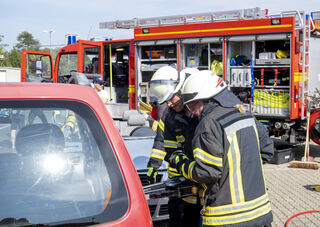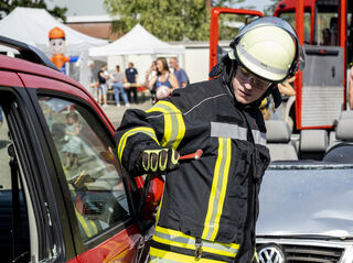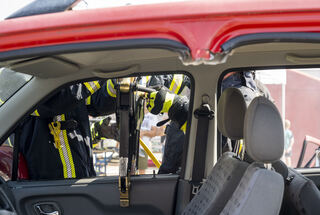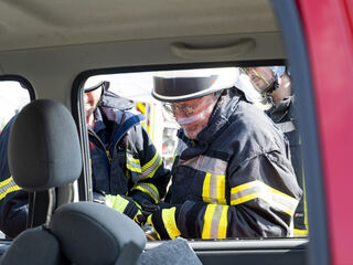 Wer möchte, kann sich mit der Rettungsschere unter fachkundiger Anleitung an einem Auto versuchen.