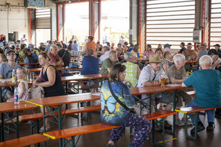 Die große Fahrzeughalle ist ausgeräumt und bietet an den Bierbänken ein wenig Schutz vor der brütenden Hitze.