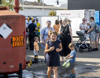 Ein ehemaliger Schadstoffbehälter wurde zu einer Art Dusche umgebaut, an dem sich Kinder gerne erfrischen.
