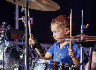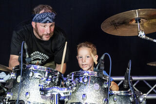 Auf der Mitmachbühne für Kids gibt Emil am Schlagzeug unter der Aufsicht von Stefan richtig Gas.