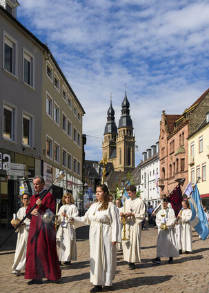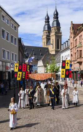 Der Prozessionszug erreicht den Postplatz, im Hintergrund die Kirche St. Joseph.