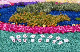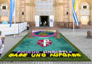 Vorm Dom geht der Blütenteppich aufs Leitwort des Tages ein.