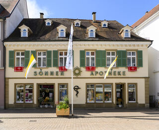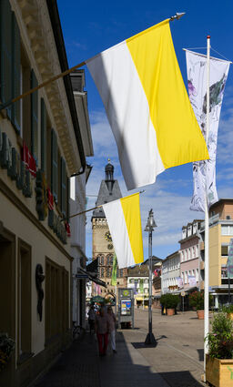 Manche Häuser der Innenstadt sind mit Fahnen in den Farben der Kirche geschmückt.