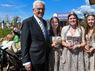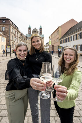 Die Pfälzische Weinkönigin Lea Bassler stößt mit ihren Prinzessinen Lea Lechner und Sandra Eder, offene Haare, auf das Gelingen der Messe an.