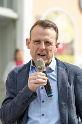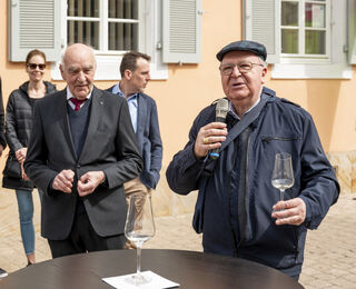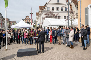 Zur Eröffnung am Geschirrplätzel erschienen zahlreiche geladene Gäste. Der Vorsitzende von Pfalzwein e.V. spricht ein Grußwort.