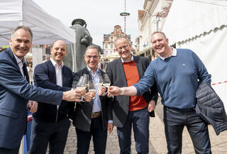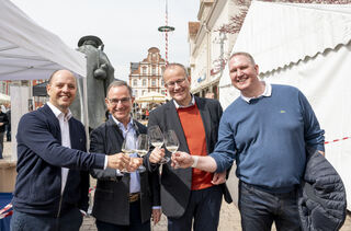 Bei der Eröffnung geniessen die Vorstände der Vereinigten VR Bank Kur- und Rheinpfalz, Thomas Sold, Rudolf Müller, Sprecher, Till Messmer und Achim Seiler ein Glas Sekt.