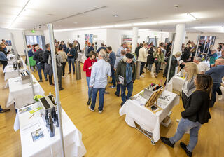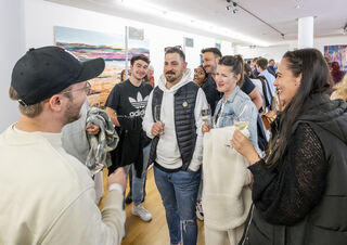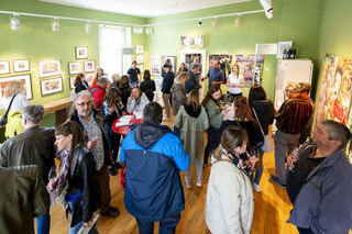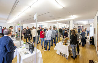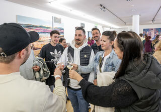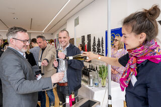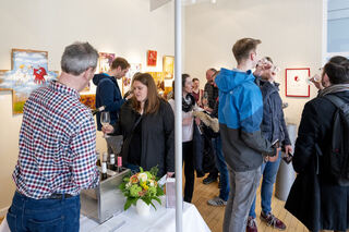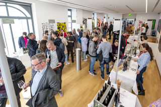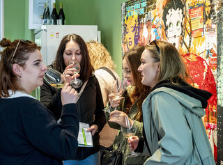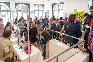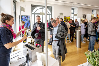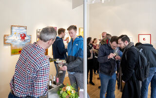Im Kulturhof Flachsgasse, hier in den Räumen des Kunstvereins, kann man Wein- und Kunstgenuss gut kombinieren. Die Besucher sind gut gelaunt und haben viel Spaß.