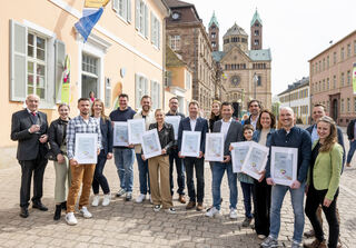Bei der Eröffnung geniessen der Landrat Landkreis Südliche Weinstrasse Dietmar Seefeldt und die Vorstände der Vereinigten VR Bank Kur- und Rheinpfalz, Thomas Sold, Rudolf Müller, Sprecher, Till Messmer und Achim Seiler ein Glas Sekt.