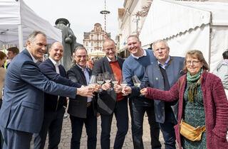 Bei der Eröffnung genießen der Landrat Landkreis Südliche Weinstrasse Dietmar Seefeldt und die Vorstände der Vereinigten VR Bank Kur- und Rheinpfalz, Thomas Sold, Rudolf Müller, Sprecher, Till Messmer und Achim Seiler mit dem Landrat Landkreis Bad Dürkheim Hans-Ulrich Ihlenfeld und der städtischen Beigeordneten Irmgard Münch-Weinmann ein Glas Sekt.