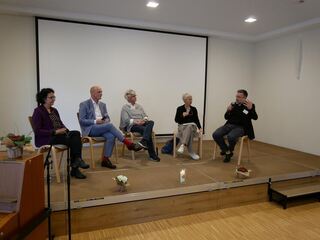 Auf dem Podium geht es um die konkrete Umsetzung des Transformationsprozesses hin zur Großgemeinde "Mittlere Kurpfalz" (v. l.): Barbara Winter-Riesterer, Projektkoordinatorin Kirchenentwicklung 2030 bei der Erzdiözese Freiburg, Daniel Born, Vizepräsident des Landtags und religionspolitischer Sprecher der SPD, Gabriele Wegmann-Rey, ehrenamtliche Projektleiterin, Doris Steinbeißer, Moderation, und Pfarrer Christian Müller.