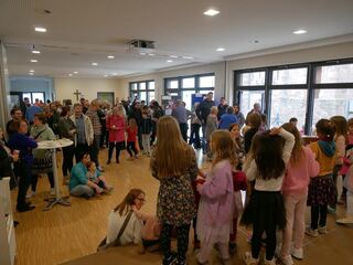 Der Saal im Wendelinushaus in Reilingen ist gut gefüllt: Viele Projektbeteiligte und weitere Gemeindemitglieder suchen den Austausch über das Zukunftsprojekt.