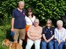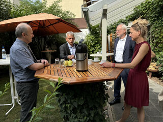 Dr. Josef Dalcolmo, (v. l.) Dr. Patrick Rapp, Dr. Hartmut Henkel und Ute von Hoerner dikutieren im Garten des Unternehmens.
