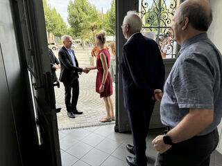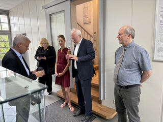 Geschäftsführerin Ute von Hoerner begrüßt Staatsekretär Dr. Patrick Rapp. Die beiden Geschäftsführer Dr. Hartmut Henkel und Dr. Josef Dalcolmo warten im Eingangsbereich.