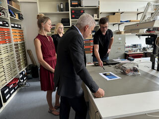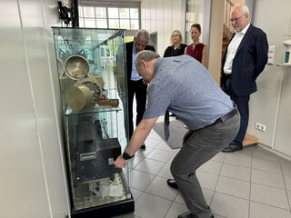 Dr. Josef Dalcolmo (Vordergrund) zeigt Dr. Patrick Rapp geschichtliche Errungenschaften der Firma.