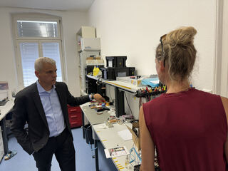 Dr. Patrick Rapp lässt sich von Ute von Hoerner die Räumlichkeiten erklären.