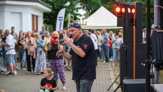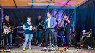 Der Leadsänger der T-Band - Klaus Schenk - zeigt schnell eine grandiose Bühnenpräsenz und begeistert mit seinen Bandkollegen die Besucher,