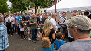 Eine der ersten Amtshandlungen des neu gewählten Neulußheimer Bürgermeisters Kevin Weirether ist die Eröffnung der Veranstaltung gemeinsam mit der Leiterin des Kulturamtes Alexandra Özkalay (links). Die Musiker der T-Band stehen schon bereit für ihren Auftritt.