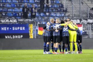 Spieler vom SV Waldhof Mannheim schwören sich mit einem Mannschaftskreis vor dem Anpfiff ein.