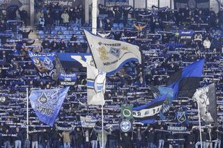 Die Ultras vom SV Waldhof Mannheim schwenken in der Fankurve ihre Fahnen.