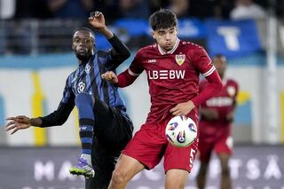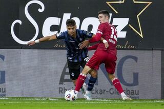 Zweikampf-Szene zwischen Adama Diakhaby (SVWM, 27) und Mirza Catovic (VfB II, 5).