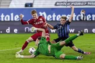 Jordan Aleksander Majchrzak (VfB II, 30), Thijmen Nijhuis (Torwart, SVWM, 1), Nicklas Shipnoski (SVWM, 7) beim Zweikampf.