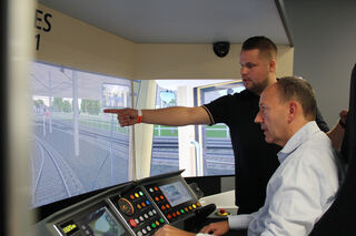 Fahrlehrer Marco Schuschill weist Bürgermeister Specht in den Simulator ein.
