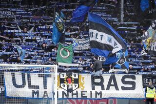 Die mitgereisten Ultras vom SV Waldhof Mannheim schwenken in der Fankurve ihre Fahnen.