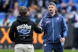 Luc Holtz (Cheftrainer von SVWM) und Stefan Kleineheismann (Cheftrainer von TSG II) begrüßen sich vor dem Beginn des Spiels.