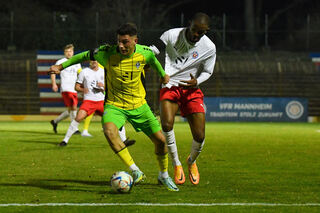 Waldhofs Stefano Russo (l.) im Zweikampf mit Max Kougagng. Zum Spenden-Derby am Dienstagabend kamen 600 Zuschauer ins Rhein-Neckar-Stadion.