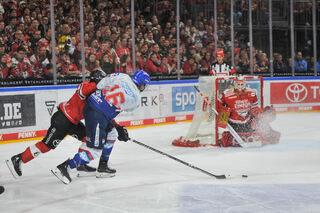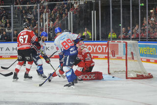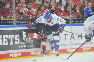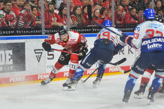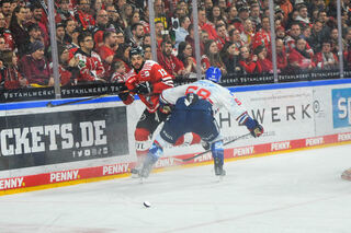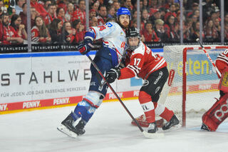 Markus Eisenschmid (Adler Mannheim) im Rennen gegen Nichols Bailen (Kölner Haie).