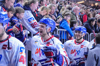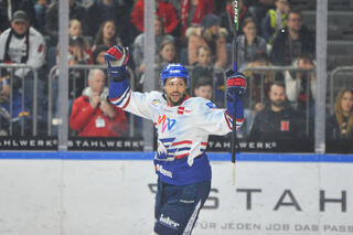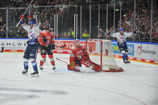 Jubel über das 1:2: v.l. Mannheims Tyler Gaudet, Kölns Mirko Pantkowski und Mannheims Matt Donovan.