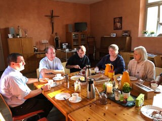 Im Speisesaal des Klosters stärken sich Pater Stefan (v. l.), Pater Robert-Maria, Pater Jürgen, Barbara Gitzinger und Helma John für den Tag.