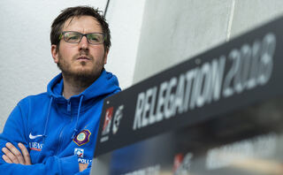 Aues Trainer Hannes Drews steht vor Beginn des Spiels im Stadion.