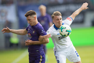 Aues Mario Kvesic (l.) im Zweikampf mit dem Karlsruher Marco Thiede...