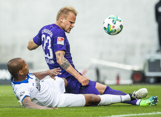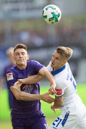 Aues Sören Bertram (r.) und Karlsruhes David Pisot kämpfen um den Ball.