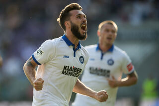 Der Karlsruher Fabian Schleusener jubelt nach seinem Tor zum 1:1.