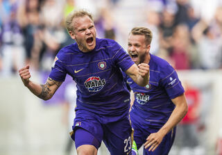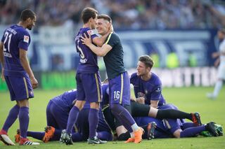 Die Spieler von Erzgebirge Aue jubeln nach dem Tor zum 3:1.
