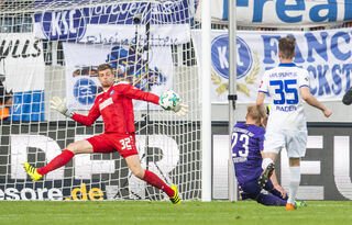 Karlsruhes Fabian Aues Sören Bertram (m.) erzielt gegen Karlsruhes Torwart Benjamin Uphoff (l.) und Matthias Bader (r.) das Tor zum 3:1...