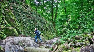 Ein robust gezimmertes Holztor mit der Aufschrift „Eingang zur wildromantischen Ruppertsklamm“ markiert den Beginn des Weges. Auf rund zwei Kilometern hat sich der Wildbach tief in den Devonschiefer gegraben und plätschert den Wanderern beim Aufstieg munter entgegen. Der Naturfreund Theodor Zais machte die Ruppertsklamm zwischen 1910 und 1912 begehbar. Bis 1930 sorgte er für die Pflege der Pfade in der Schlucht, die noch heute zahlreiche Wanderer durch die Klamm führen. Inzwischen haben die Wegepaten des Lahnwanderweges dabei ein Auge darauf, dass Wanderer sicher durch die Klamm gehen können, um die einzigartige Natur dort zu entdecken: In der Schlucht ist festes Schuhwerk für eine gute Trittsicherheit wichtig. Besonders bei feuchtem Wetter kann es auf den mit Moos bewachsenen Steinen rutschig sein. An schwierigen Stellen helfen Fixseile dabei, nicht den Halt zu verlieren.