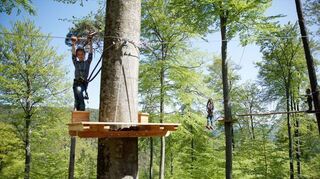 Gut versteckt liegt mitten im Biosphärenreservat Pfälzerwald in der Nähe von Elmstein der Ziplinepark. Wer den Park erst einmal gefunden hat, den erwartet ein Nervenkitzel der ganz besonderen Art: Mit 18 Seilstrecken in unterschiedlichen Höhenlagen und Längen von bis zu 120 Metern verspricht die Anlage jede Menge Abenteuerspaß. In einer etwa zweieinhalbstündigen Tour kann man – gesichert an einem Stahlseil – von Baum zu Baum durch den Pfälzerwald fliegen und auf den Plattformen ganz neue Aussichten auf verschiedene Landschafts- und Kulturschätze genießen, die in dieser Komposition nur durch den Blick von ganz oben zusammenkommen. Außerdem befinden sich auf der Strecke vier Absprünge aus Höhen von zehn bis 20 Metern, die noch einmal ganz besondere Erlebnismomente bescheren.