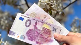 Die Stadt Bad Dürkheim präsentiert ihr neuestes Souvenir : einen 0-Euro-Schein mit Abbildungen des Gradierwerks, des Dürkheimer Riesenfasses und der Klosterruine Limburg.