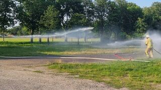 Blauer Himmel, die Sonne scheint, es herrschen angenehme 25 Grad. Perfektes Wetter für die Jugendfeuerwehr den Löschangriff auf dem Gelände gegenüber der Feuerwache zu üben, bei dem viel Wasser im Spiel ist. Doch bevor die sieben Nachwuchs-Kameraden den Einsatz üben und die „brennenden Bäume“ löschen, steht unter anderem ein Corona-Test und das Umziehen auf dem Programm – jeden Montag das gleiche Prozedere.