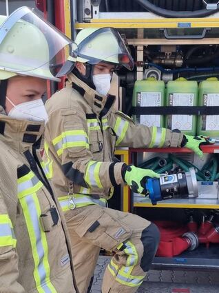 Bevor die Übungseinheit der Jugendfeuerwehr beginnt, müssen die zehn Mädchen und Jungen, die an diesem Montag da sind, einen Corona-Schnelltest machen. „Das kostet uns viel Zeit“, sagt Felix Jung, stellvertretender Jugendwart. Die sechs Leiter sind geimpft, die Kinder alle negativ. Das heißt, es kann losgehen. Immer zwei bis drei der Mädchen und Jungen dürfen gleichzeitig zum Umziehen. Die Masken müssen alle Beteiligten die ganze Zeit tragen. „Wir gehören zum Katastrophenschutz und haben daher höhere Maßnahmen als zum Beispiel Sportvereine“, erklärt Christoph Schwegler. Während die Kinder sich ihre Feuerwehr-Kleidung anziehen, gehen auch die sechs Jugendleiter in ihre Uniformen schlüpfen. Felix Jung fährt zwei Einsatzwagen aus dem Depot. Das Löschgruppenfahrzeug 8/6 stellt er auf der Fläche gegenüber der Feuerwache ab, während er das Tanklöschfahrzeug (TLF) 2040 Sonderlöschmittel (SL) auf dem Hof positioniert.