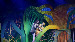 Das Geschehen auf der Bühne ist dynamisch, was auch am kunstvollen Bühnenbild liegt. Die Darsteller klettern auf Bäume, hängen in Seilen oder rutschen eine kleine Schräge hinunter. Die sieben Schauspieler sind auch immer mal wieder gemeinsam auf der Bühne und bringen mit ihren Songs Schwung in die Stadthalle.