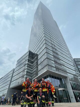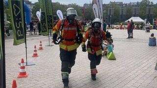 Unter den 1205 Teilnehmern in diesem Jahr befanden sich sechs Ketscher Feuerwehrleute. Neben den Krügers, die unlängst rund 1300 Kilometer von Ketsch an die Nordsee mit dem Rad fuhren, um für die Jugendfeuerwehr einen Betrag einzuheimsen (wir berichteten), hetzten Jan Brinkmann und Florian Bauer (in 14:08 Minuten, Feuerwehr-Team mit PA) sowie Malter Rieger und Paul Cischinsky (10:21 Minuten im Team-Lauf) hoch – freilich ebenso erfolgreich. Glücklicherweise sei es nicht ganz so schwül wie noch am Vortag gewesen, sagt Tanja Krüger. „Aber es war schon warm.“
