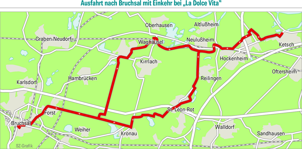Der Hinweg führte an Hockenheim und Reilingen vorbei mit Kurs auf St. Leon-Rot. Das liefert auch bereits das Stichwort für alle, die bei 74 Kilometern im Gesamten nicht mehr von Familientour sprechen. Das ist verständlich. Deshalb sei als Alternative Bruchsal ausgeklammert und an dieser Stelle auf das Minigolf Adventure am St. Leoner See (www.minigolf-stleon.de, hin und zurück auf gezeigter Route zirka 32 Kilometer) hingewiesen. Dort ist täglich von 11 bis 22 Uhr geöffnet, wobei die Küche – der Biergarten ist behaglich – bereits um 20 Uhr schließt. Die letzte Schlägerausgabe ist für 20.30 Uhr vorgesehen.