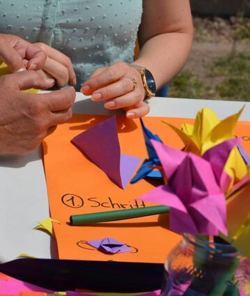 Richtig wilde Kerle und Mädels brauchte es für das Wikingerschach, bei dem lange Holzquader geschleudert werden mussten. Ein wenig ruhiger und gesitteter waren da die Regeln beim Dosenwerfen – auch wenn es bei jedem Treffer laut schepperte. Beim Flaschenkegeln und Ringwurf kam es auf das Geschick an. Und wer dann doch lieber einen Schatz heben oder Origami-Blüten falten wollte, fand einen Ruhepol an den Tischen. Besonders begeistert nahmen die Kinder den Blindenparcours an, der jedes Kind herausforderte. Aber auch die Blindverkostung war nicht nur fordernd, sondern spannend: Wer konnte ohne hinzusehen schon ein Toastbrot erschmecken? Mit einem Glücksrad und einem heißen Draht, dem gezielten Schuss auf die Fußballwand und dem Malen zu sinnlicher Musik konnten sich alle Gäste des Festes beschäftigen und damit die Schule in ihrer Freizeit genießen.
